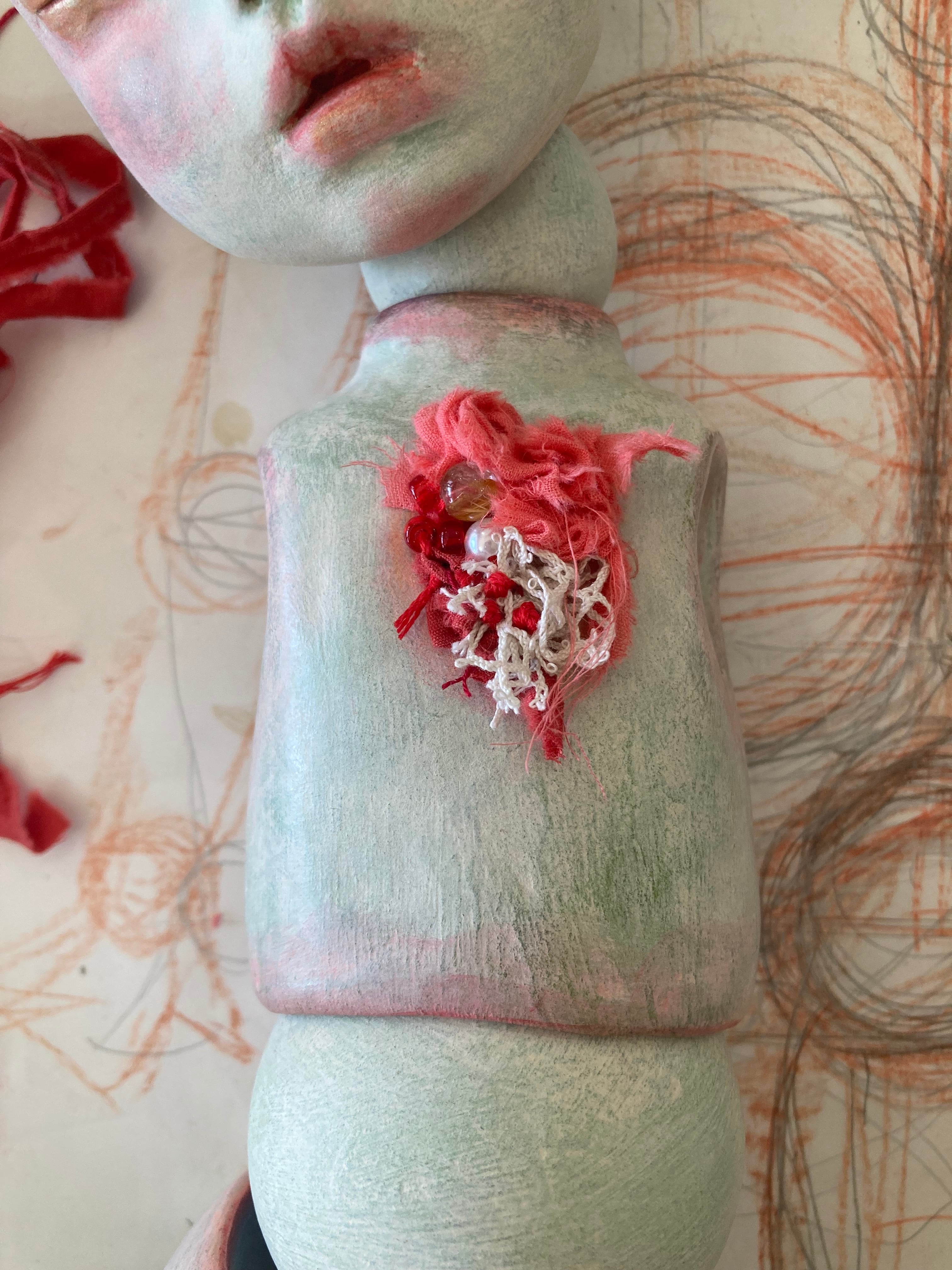 お人形のみの販売です。タマゴのオブジェは付きません。胸の飾りは穴をあけて縫い付けてます。